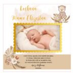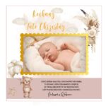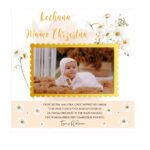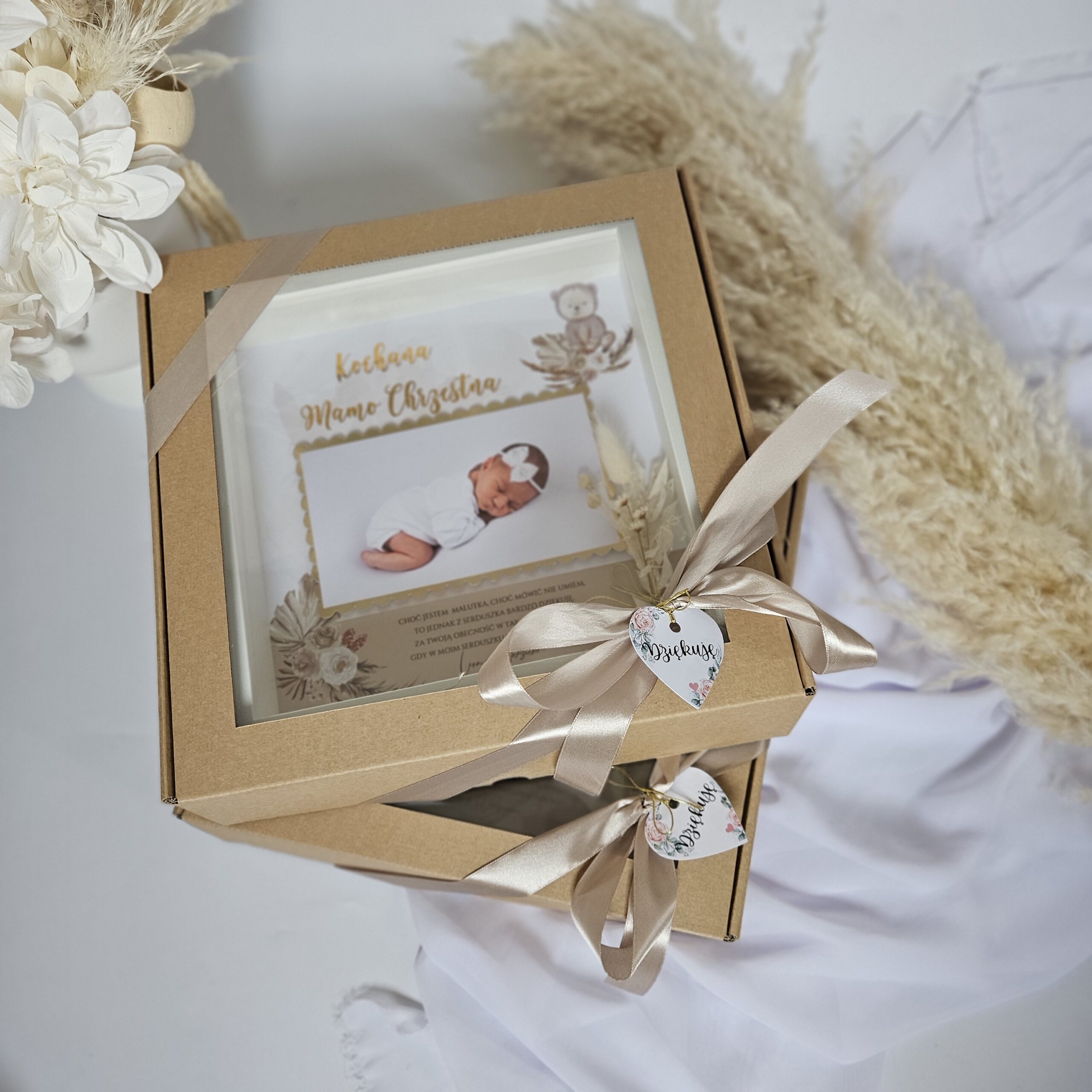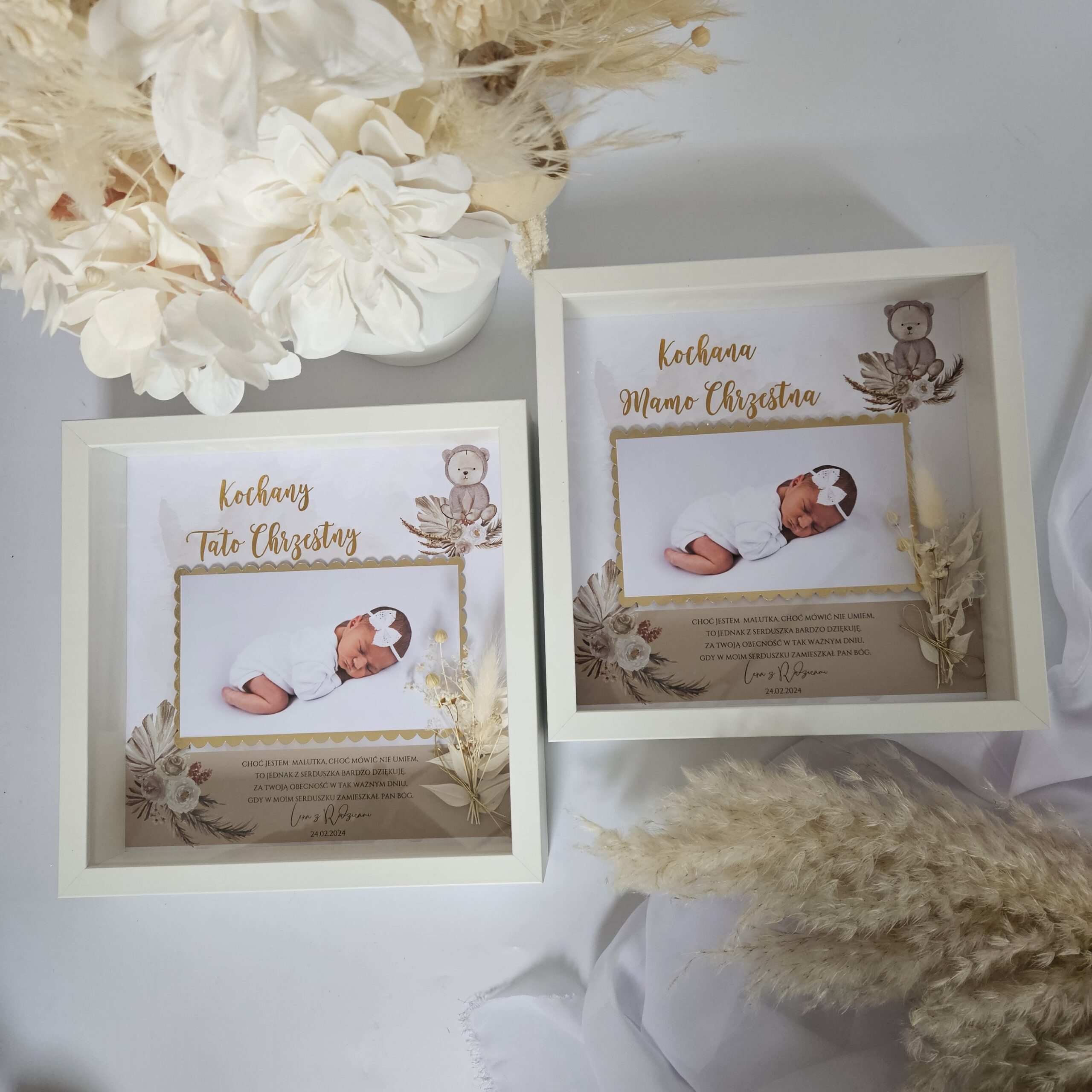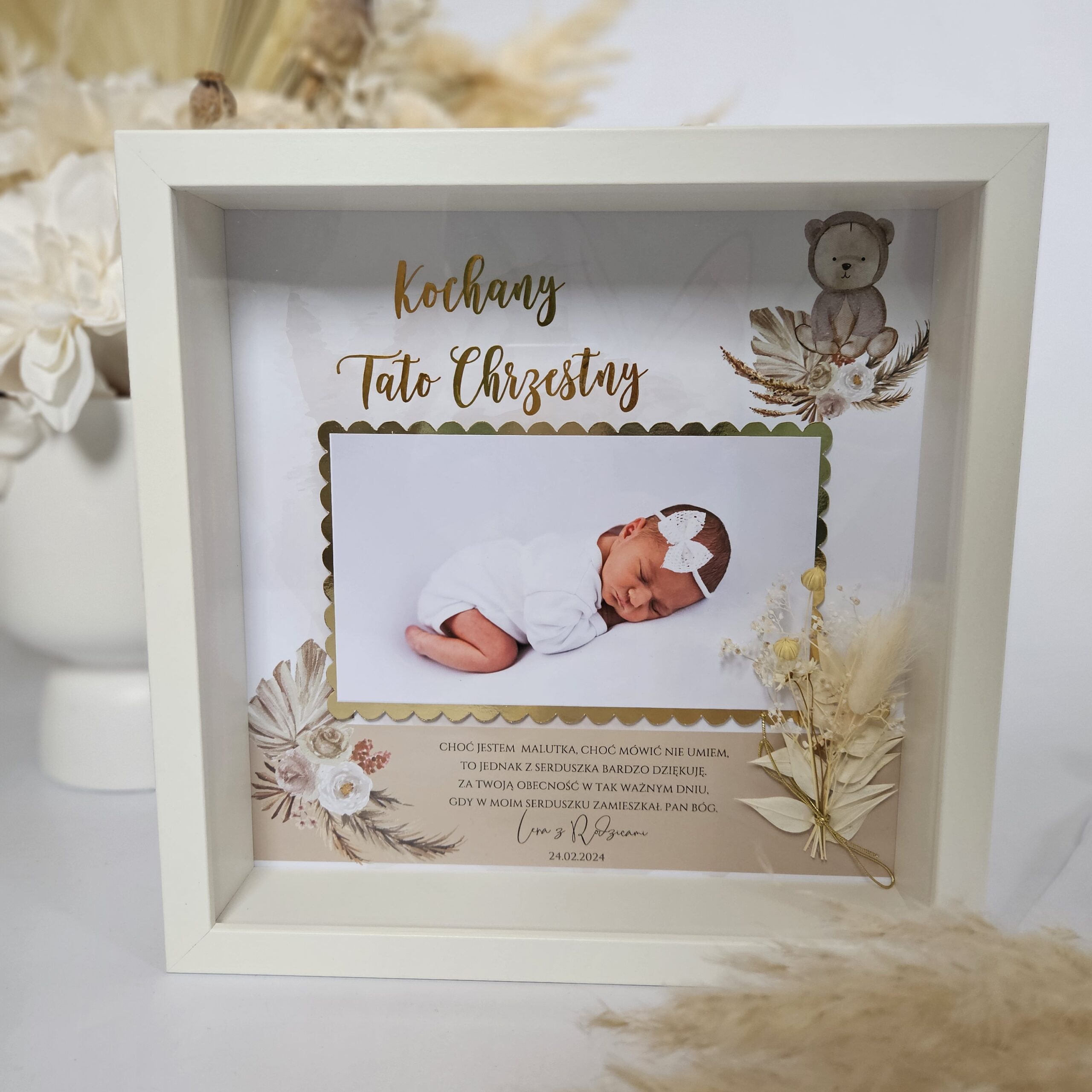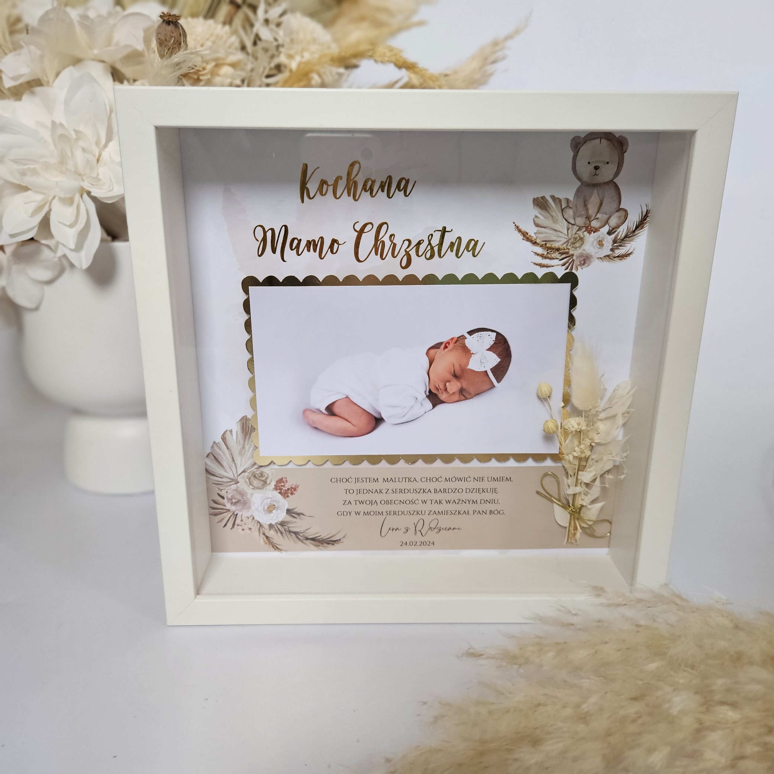Ramka 3D ma elegancki, nowoczesny design. Wewnątrz ramki znajduje się zdjęcie maluszka, mini bukiecik z suszonych kwiatów, a w górnej części ramki umieszczono złoty napis „Kochanej Mamie Chrzestnej/Kochanemu Tacie Chrzestnemu/ Kochanym Rodzicom Chrzestnym”. Ramka jest przestrzenna, co sprawia, że zdjęcie dziecka wydaje się unosić, tworząc efekt trójwymiarowości. Całość jest utrzymana w stonowanej kolorystyce, co sprawia, że ramka harmonijnie wpasuje się w każde wnętrze. Taki prezent nie tylko będzie ozdobą, ale również pamiątką na długie lata, przypominającą o ważnym dniu chrztu oraz o bliskich relacjach z rodzicami chrzestnymi.