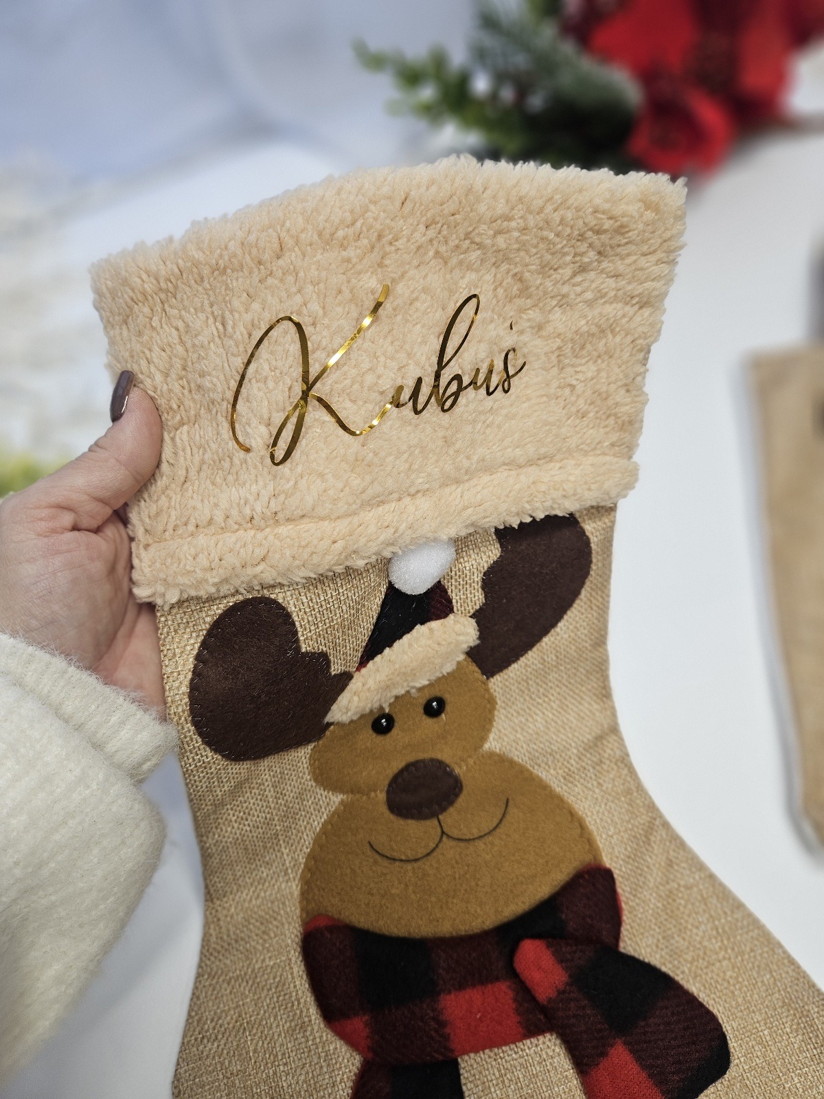 🌟 Skarpeta świąteczna z imieniem – wyjątkowa dekoracja na kominek w komplecie z torbą na prezenty