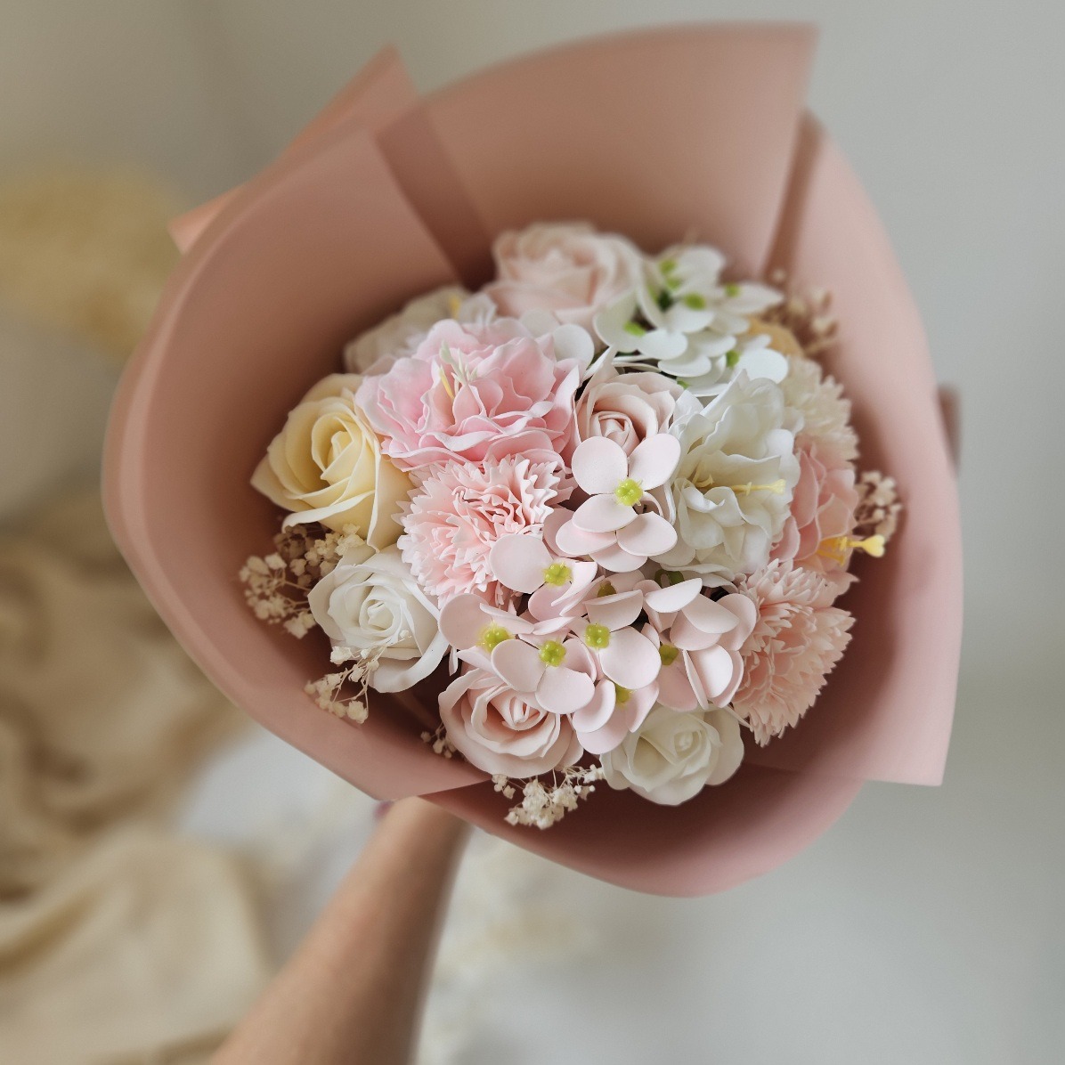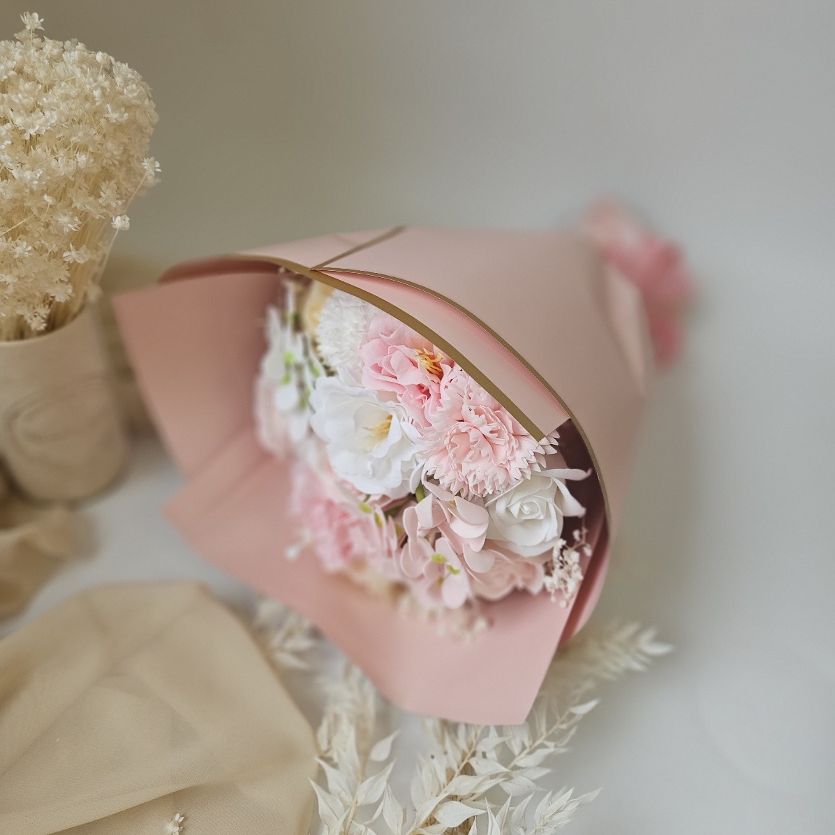 Przygotowaliśmy dla Ciebie wyjątkowy produkt, idealny upominek na różne okazje– piękne róże mydlane, ozdobioną stabilizowaną gipsówką. Ta unikalna kompozycja łączy w sobie estetykę oraz funkcjonalność, tworząc niepowtarzalny prezent, który z pewnością zachwyci obdarowaną osobę. Róża mydlana to nie tylko piękna dekoracja, ale także luksusowy element pielęgnacji, który wprowadzi do każdej kąpieli odrobinę magii.