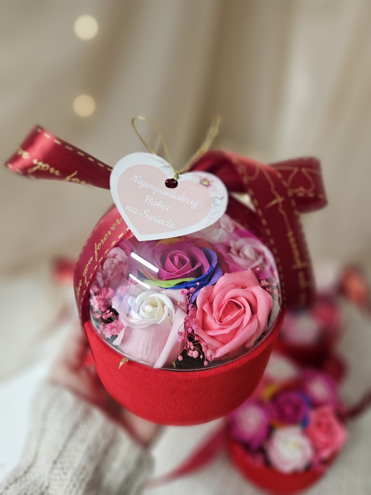 Szukasz wyjątkowego prezentu, który na długo zapadnie w pamięć i wywoła uśmiech na twarzy obdarowanej osoby? Flower Box Kopułka z kwiatami mydlanymi to idealne rozwiązanie. Delikatne, pięknie pachnące kwiaty zostały ułożone w stylowym, eleganckim, welurowym pudełku.