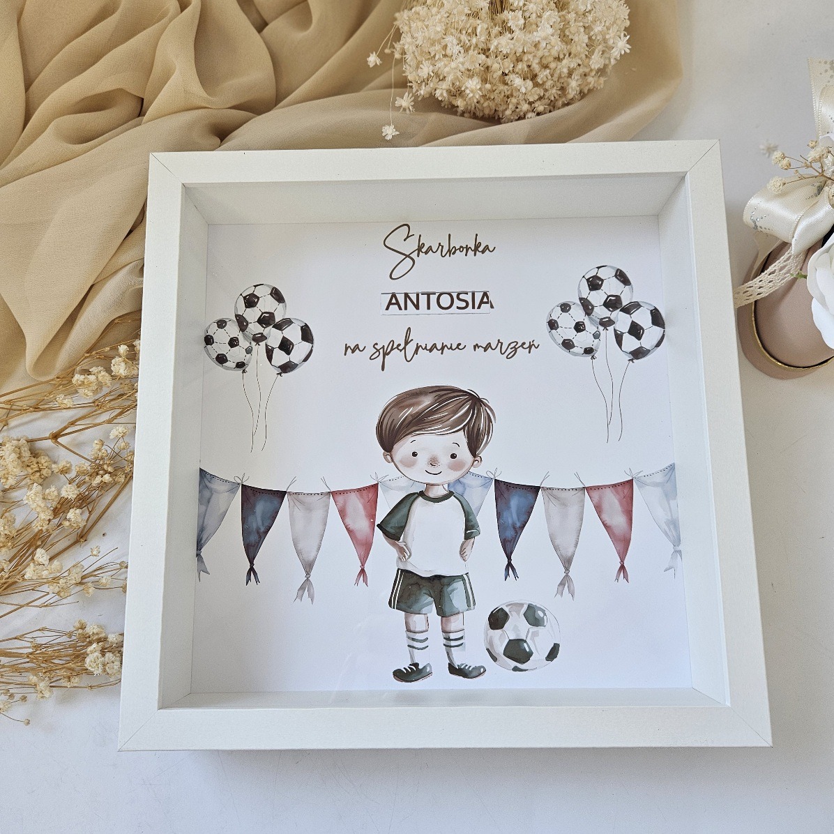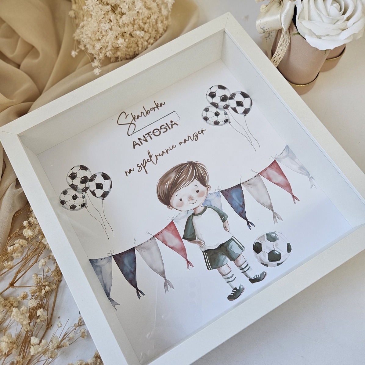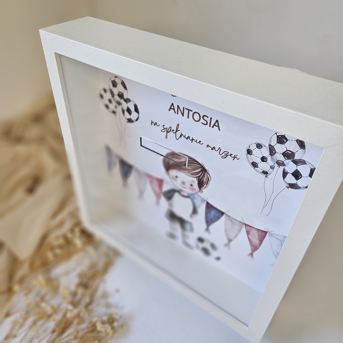 Odkryj wyjątkowy sposób na oszczędzanie z naszą personalizowaną skarbonką! Ta elegancka skarbonka z perosnalizowaną grafiką i tekstem, to nie tylko praktyczny dodatek, ale także stylowy element dekoracyjny. Dzięki innowacyjnemu projektowi, możesz ją powiesić na ścianie lub dumnie ustawić na komodzie, korzystając z wbudowanej tylniej nóżki. Praktyczny otwór na pieniądze umieszczony w przedniej szybce sprawi, że dodawanie oszczędności stanie się przyjemnością. Spersonalizuj swoją skarbonkę i wprowadź odrobinę magii do swojego wnętrza — to doskonały prezent dla dziecka,bdla siebie lub bliskiej osoby!